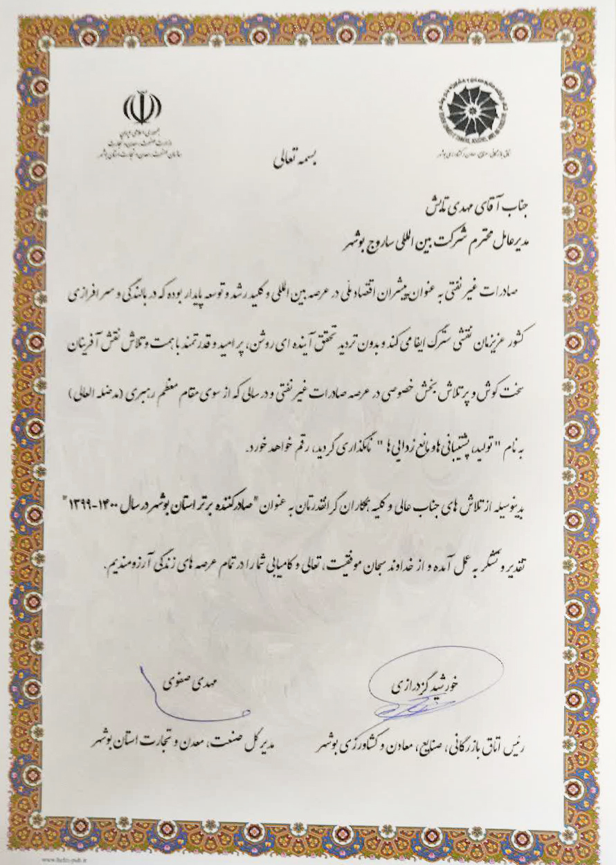 در آیین تجلیل از صادرکنندگان برتر استان بوشهر که با حضور آقای دکتر باستین معاون هماهنگی اقتصادی استانداری بوشهر در روز سه شنبه 12 مهر 1401 و در محل اتاق بازرگانی استان بوشهر برگزار شده بود، شرکت بین المللی ساروج بوشهر ( کارخانه سیمان کنگان) به عنوان صادر کننده برتر استان بوشهر در سال 1400 _ 1399 معرفی و با اهدای لوح و تندیس از این شرکت تجلیل شد.