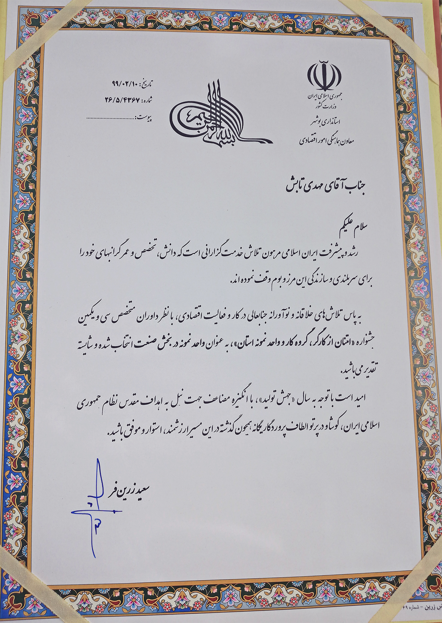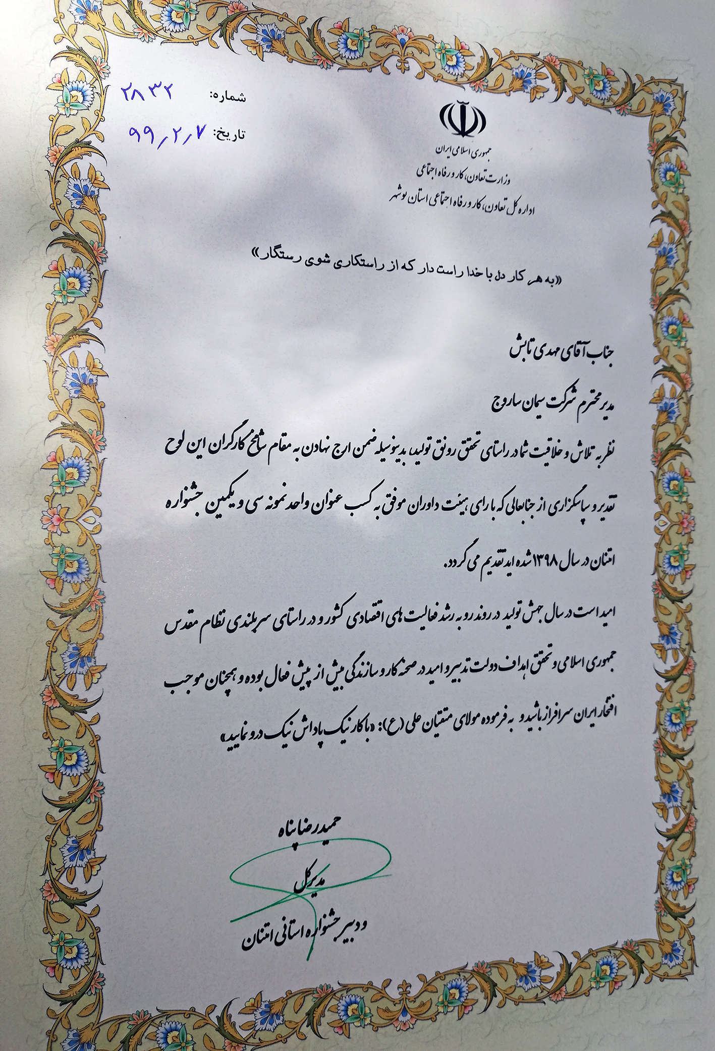 شرکت بین المللی ساروج بوشهر به عنوان واحد نمونه بخش صنعت استان بوشهر انتخاب شد.