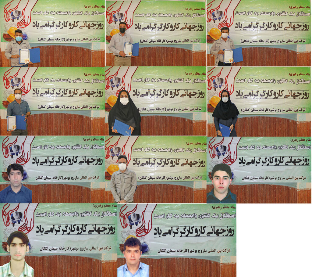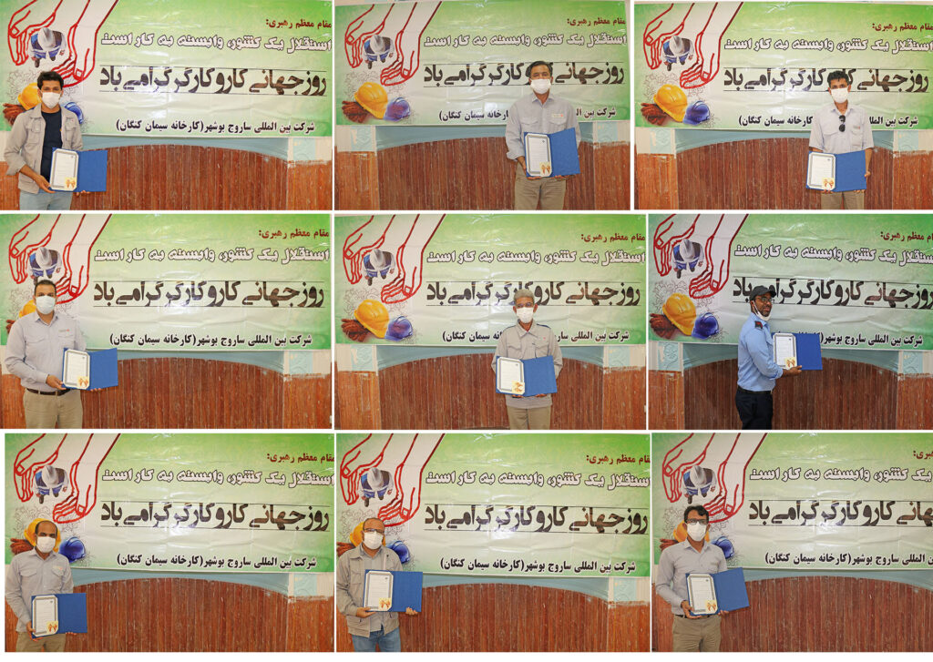 مراسم تقدیر از کارگران نمونه شرکت بین المللی ساروج بوشهر در روز شنبه مورخه 11 اردیبهشت ماه 1400 و همزمان با روز جهانی کارگر و با حضور کارگران نمونه، مدیر عامل شرکت، مدیر کارخانه سیمان کنگان، تعدادی از مدیران و نمایندگان شورای اسلامی کار با رعایت پروتکل های بهداشتی در مسجد کارخانه سیمان برگزار گردید و از 20 نفر کارگر نمونه واحدهای مختلف شرکت با اهدای لوح و هدیه تقدیر به عمل آمد.