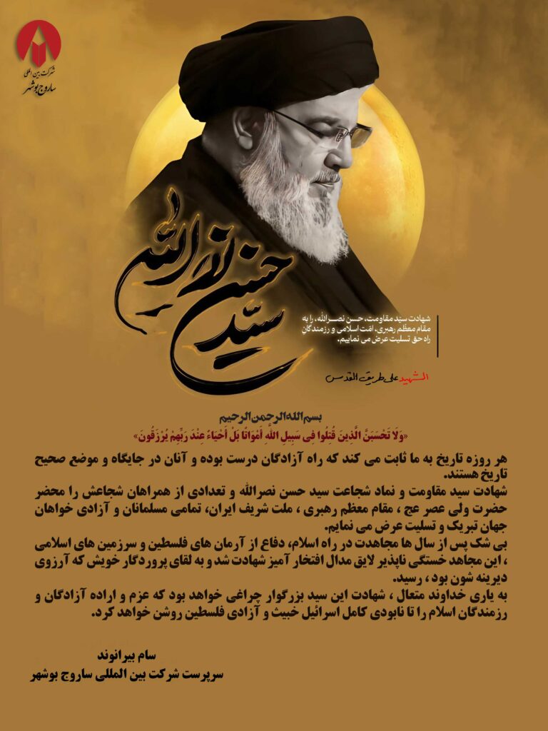 شهادت سید مقاومت و نماد شجاعت سید حسن نصرالله و تعدادی از همراهان شجاعش را محضر حضرت ولی عصر عج ، مقام معظم رهبری ، ملت شریف ایران، تمامی مسلمانان و آزادی خواهان جهان تبریک و تسلیت عرض می نمایم.