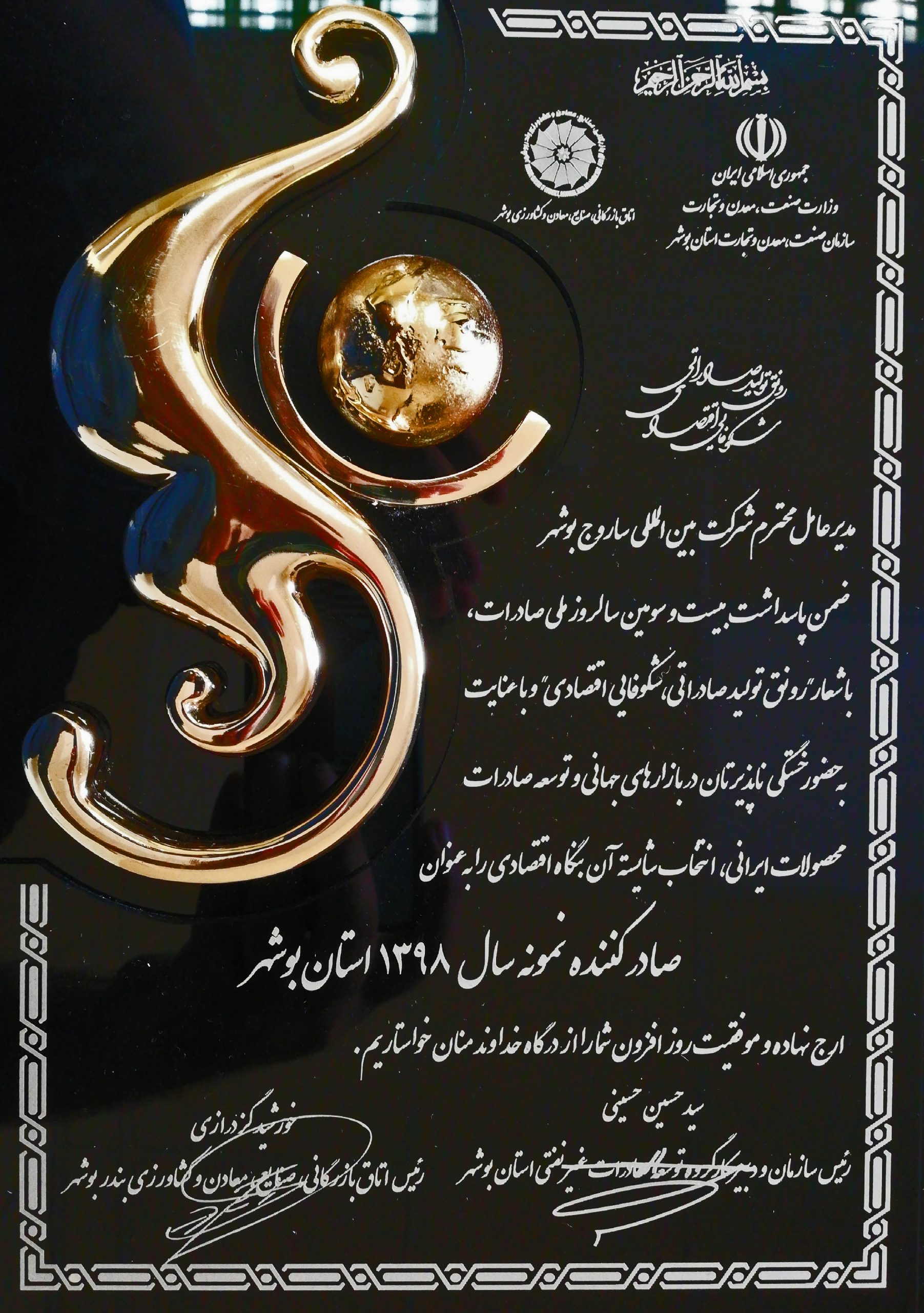 در آئین معرفی و تجلیل از صادرکنندگان نمونه استان بوشهر که روز پنجشنبه مورخه 12/10/98 و با حضور حمید زادبوم، معاون وزیر صنعت، معدن و تجارت، عبدالکریم گراوند، استاندار بوشهر، مسعود خوانساری، رئیس اتاق بازرگانی، صنایع، معادن و کشاورزی تهران و جمعی از کارشناسان، تجار و بازرگانان این استان برگزار شده بود، شرکت بین المللی ساروج بوشهر (کارخانه سیمان کنگان ) به عنوان صادرکننده نمونه استان بوشهر در سال 1398 معرفی و از آن تجلیل شد.