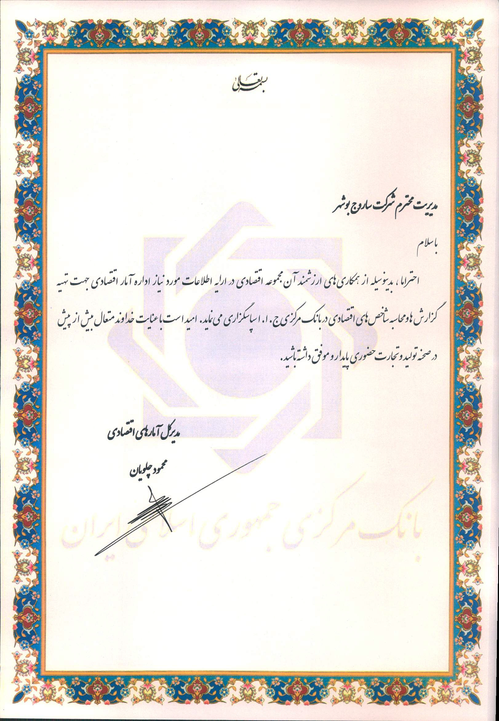 تقدیرنامه بانک مرکزی از شرکت بین المللی ساروج بوشهر بدلیل همکاری در ارائه آمار مورد نیاز اداره امار