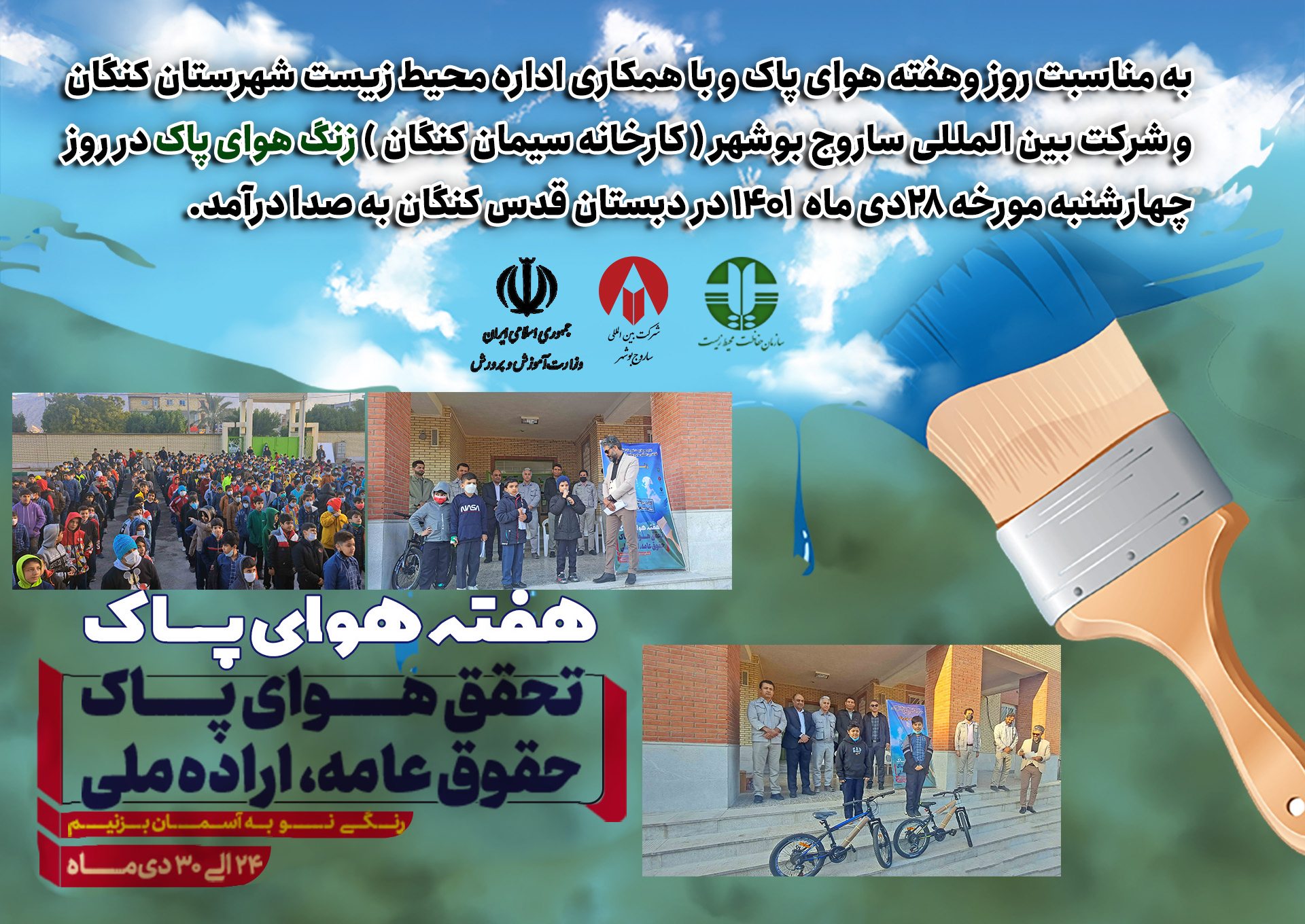 به مناسبت روز وهفته هوای پاک و با همکاری اداره محیط زیست شهرستان کنگان و شرکت بین المللی ساروج بوشهر ( کارخانه سیمان کنگان ) زنگ هوای پاک در دبستان قدس کنگان به صدا درآمد.