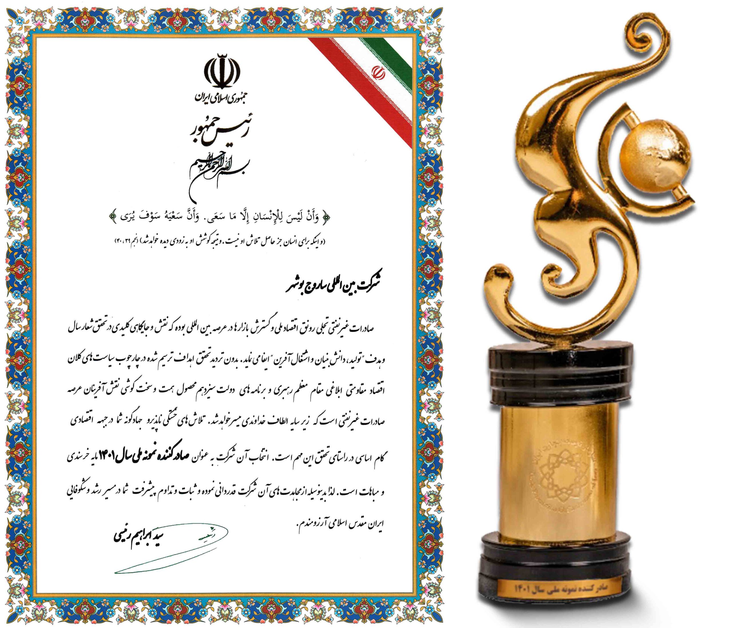 در مراسم روز ملی صادرات با حضور رئیس جمهور از شرکت بین المللی ساروج بوشهر به عنوان صادرکننده نمونه ملی 1401 تقدیر شد.
